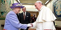 - 【바티칸=AP/뉴시스】프란치스코 교황이 3일 바티칸에서 엘리자베스 2세 영국 여왕과 악수하며 방문을 환영하고 있다. 엘리자베스 여왕은 즉위 1년 전인 1951년 교황 비오 12세부터 지금까지 5명의 교황을 만났다.