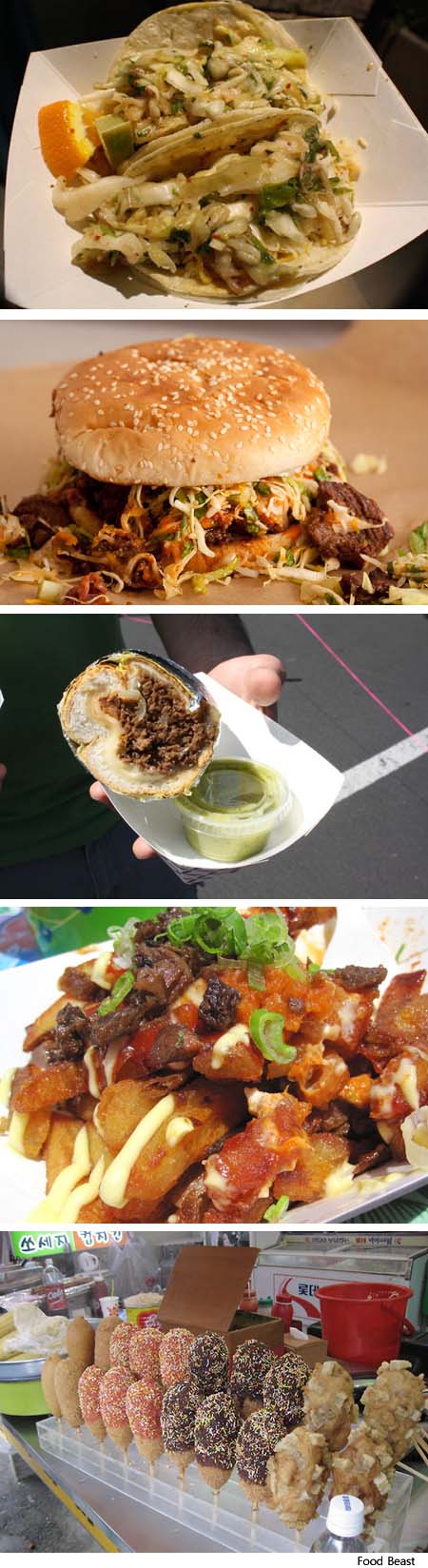 최근 주목을 받고 있는 미국의 유명 음식 블로그 ‘푸드비스트’에 소개된 한국 음식들이다. 현지인들이 먹기에 좋도록 서구화된 한식이다. 맨 위는 매콤한 돼지고기 타코 요리다. 두 번째는LA에서 트럭에 음식을 싣고 다니…