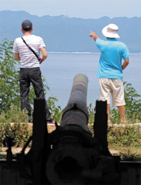 ▲ “저기가 北 해안포 쏜 곳” 백령도 심청각을 찾은 관광객들이 10일 전시용 견인포 앞에서 북한 해안포대가 있는 장산반도를 바라보고 있다. 북한은 9일 서해 북방한계선(NLL)을 향해 해안포 110여발을 발사했으며, 이 중 10여발이 NLL 이남 우리측 관할 수역에 떨어진 것으로 확인됐다. /연합뉴스