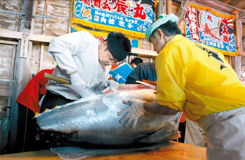 해체가 끝나면 시식 코너가 운영되는데 한국에서 왔다고 하니 진행자가 허 화백에게 우선권을 준다. 비록 한 점이지만 지방의 고소함과 부드러운 육질, 그리고 입안에 퍼지는 풍미가 예사롭지 않은 듯 허 화백이 잠시 동안 말이 없다. 참치 하면 일본 사람들은 혼마구로(本まぐろ), 즉 참다랑어를 꼽는데 여기에 오마 참치라는 이름값이 겹치니 제아무리 까다로운 미식가라도 당해낼 재간이 없는 것이다. 참고로 참치 종류로는 참다랑어 외에 황다랑어, 백다랑어, 눈다랑어, 날개다랑어, 가다랑어가 있으며 통상 가장 맛있고 비싼 참치로 참다랑어를 꼽는다. 흔히 싼값에 리필이 가능하다는 참치는 황새치, 청새치, 돛새치의 새치류로 엄밀히 따지면 참치와 같은 부류는 아니다.