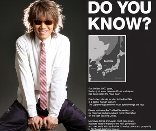 더구나 최근들어 친일파들이 장악한 MB정권이 일본을 우리나라에 끌어들이려는 노골적인 시도가 보이고 일본은 독도가 일본땅이라는 사실을 학생들에게 가르치지만 정치인 중 누구하나 신경쓰지 않는 가운데 기부천사 김장훈이 미국의 3대 일간지에 동해와 독도가 우리땅이라는 광고를 냈다는 훈훈한 소식이 있었습니다.