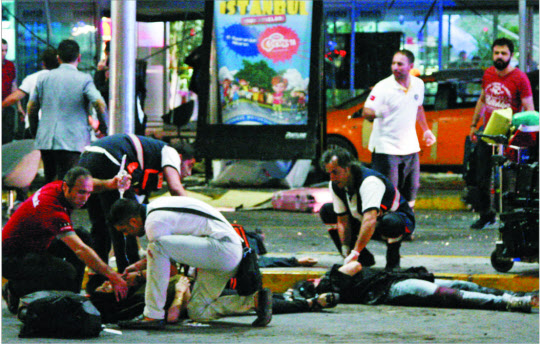 28일 밤 터키 이스탄불 아타튀르크 국제공항에서 벌어진 총격·자살 폭탄 테러는 5분 만에 36명의 목숨을 앗아가고 140여명의 사상자를 냈다. 현장 목격자 증언과 터키 보안 당국에 따르면, 괴한 3명은 이날 오후 9시 50분쯤 각자 택시를 타고 공항에 도착했다. 이중 1명은 공항 주차장, 나머지 2명은 국제선 터미널로 향했다. 이들은 9시 55분쯤 일제히 숨겨둔 AK-47 소총을 꺼내 들고 무차별 공격을 개시했다. 남아공 관광객 폴 루스는 미국의소리(VOA) 방송 인터뷰에서 "도착장으로 막 나왔을 때 50m 가량 앞에서 복면은 하지 않았지만 온통 검은 옷을 입은 남자가 자기 앞을 지나가는 사람이라면 가리지 않고 마구 총을 쐈다"며 "카운터 뒤에 숨었는데, 곧 총격 소리가 멈추고 큰 폭발음이 들렸다"고 말했다.