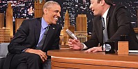 - 8일 버락 오바마 미국 대통령(왼쪽)이 뉴욕 NBC방송 ‘더 투나이트 쇼 스타링 지미 팰런’에 출연해 진행자 지미 팰런과 이야기를 나누고 있다. 민주당 선거자금 모금 행사에 참석하기 위해 뉴욕을 방문한 오바마 대통령은 이날 대선 경선 과정에서 분열된 민주당의 통합을 우…