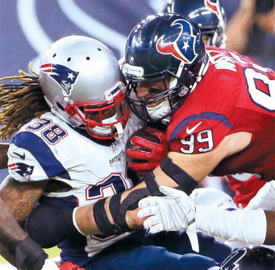 가장 격렬한 스포츠 중 하나로 꼽히는 미 프로풋볼(NFL) 선수들은 CTE(만성 외상성 뇌병증)의 위협에 노출돼 있다. 이는 미국 스포츠계의 가장 뜨거운 논란거리다. 사진은 작년 12월 뉴잉글랜드 패트리어츠와 휴스턴 텍산스의 경기에서 선수들끼리 충돌하는 장면. /AP 뉴시스