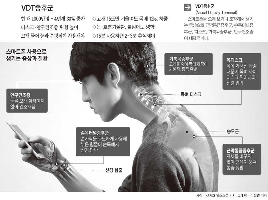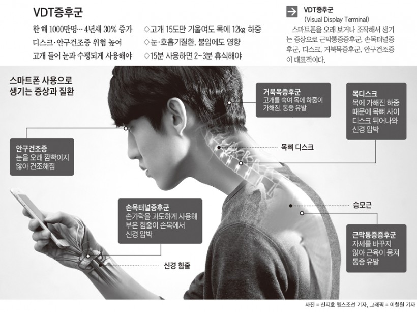 과도한 스마트폰 사용으로 생기는 병 'VDT증후군'을 앓는 사람들이 1000만명에 달하는 것으로 나타났다. 건강보험심사평가원에 따르면 2014년 근막통증증후군, 손목터널증후군, 허리·목디스크, 거북목증후군, 안구건조증의 환자 수는 총 967만여명이다.