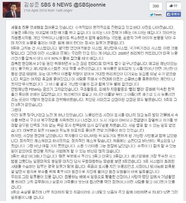 - SBS <SBS 8 뉴스>의 김성준 앵커가 세월호 침몰 사고와 관련해 시스템을 비판하며 국민들에게 격려의 말을 전했다.김성준은 21일 자신의 사회관계망서비스(SNS) 트위터에 “오늘은 3류라는 자괴감에 대해 얘기를 하고 싶다”고 말문을 열었다. 그는 “나라 …