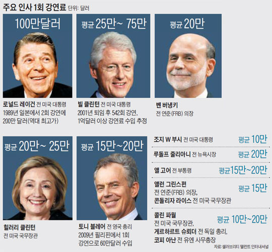 토니 블레어 전 영국 총리도 2009년 필리핀에서 1회 강연에 60만달러를 받은 적이 있다. 조지 W 부시 전 대통령은 평균이 15만달러 정도고, 지미 카터 전 대통령은 고액 강연을 하지 않는다. 전직 대통령 가운데 최고 강연료 기록은 로널드 레이건 전 대통령이 세웠다. 강연을 잘 하지 않는 그는 희소성을 앞세워 1989년 일본 강연 2번에 200만달러를 받았다.