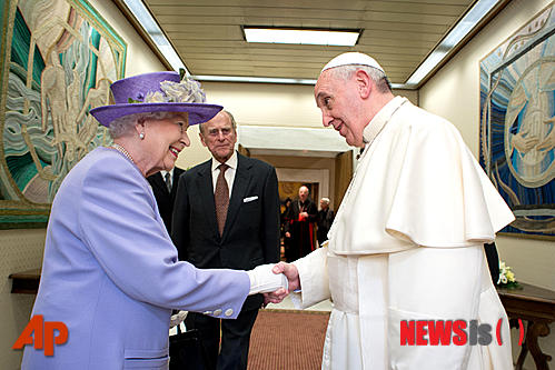 - 【바티칸=AP/뉴시스】프란치스코 교황이 3일 바티칸에서 엘리자베스 2세 영국 여왕과 악수하며 방문을 환영하고 있다. 엘리자베스 여왕은 즉위 1년 전인 1951년 교황 비오 12세부터 지금까지 5명의 교황을 만났다.