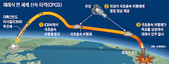 CPGS는 대륙간탄도미사일(ICBM) 추진체를 이용해 음속의 최고 20배 속도로 날아가 전 세계의 목표물을 1시간 내 공격하는 신개념 미사일로, 조지 W 부시 대통령 시절인 2000년 개발이 시작됐다.