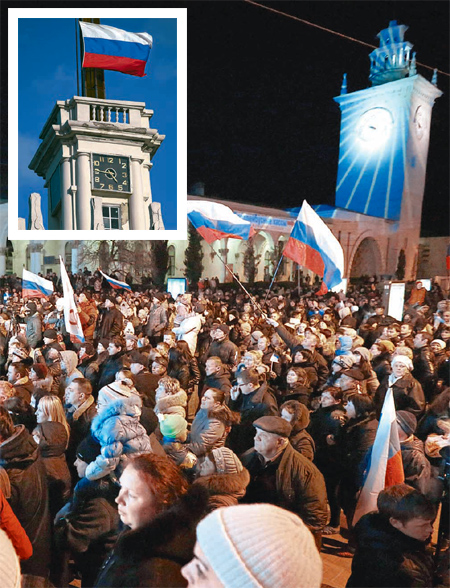 - 크림공화국이 29일 오후 10시 표준시간을 2시간 당겨 30일 0시로 만들었다. 모스크바 표준시에 맞추기 위해서다. 러시아 국기가 걸린 크림 수도 심페로폴의 철도역 시계탑이 크림의 현주소를 상징적으로 보여준다(왼쪽 위 작은 사진). 시계탑 바늘이 30일 0시로 바뀌자 …