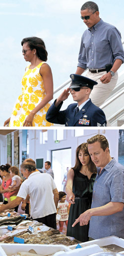 - 각국 정상의 여름휴가가 세간의 관심을 끌고 있다. 위 사진은 10일(현지시간) 미 매사추세츠주 케이프코드에 도착한 대통령 전용기 에어포스원에서 버락 오바마 미 대통령(오른쪽)과 부인 미셸이 내리고 있는 모습. 아래 사진은 지난달 26일 데이비드 캐머런 영국 총리(오른쪽…