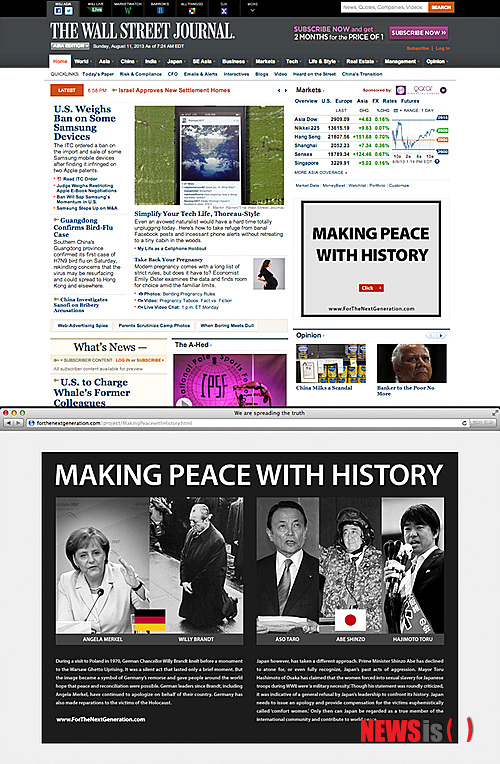 - 월스트리트저널 웹사이트에 독일과 일본의 역사의식을 비교하는 광고가 실려 화제가 되고 있다.'Making Peace With History(역사를 통한 평화만들기'라는 제목의 온라인 광고를 클릭하면 독일의 빌리 브란트 총리와 메르켈 총리의 사죄하는 사진과 일본의 장갑차 …