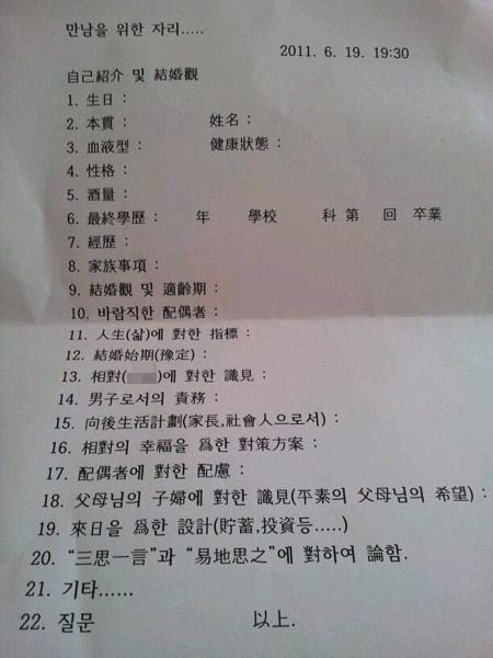 인터넷을 통해 ‘남친 면접 설문지’가 급속히 퍼지고 있다. 한 아버지가 딸의 남자친구 면접용으로 작성했다는 이 설문지를 두고 네티즌들은 갑론을박 논쟁을 벌이고 있…