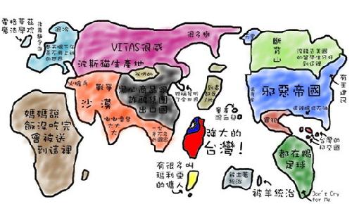 ‘대만 어느 학생의 지도’ 등의 이름으로 소개되고 있는 이 지도에는 지도 위에 국가 이름 대신 그 나라에 대해 자신이 생각하는 특징을 적어놨다.