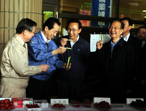- 이명박 대통령과 원자바오(溫家寶) 중국 총리, 간 나오토(菅直人) 일본 총리가 2011년 5월 21일 오후 일본 미야기현 아즈마 종합운동공원내 실내체육관에서 이 지역 농산물의 우려를 불식시키기 위해 후쿠시마産 오이를 시식하고 있다. /청와대사진기자단지난 21일 일본 후…