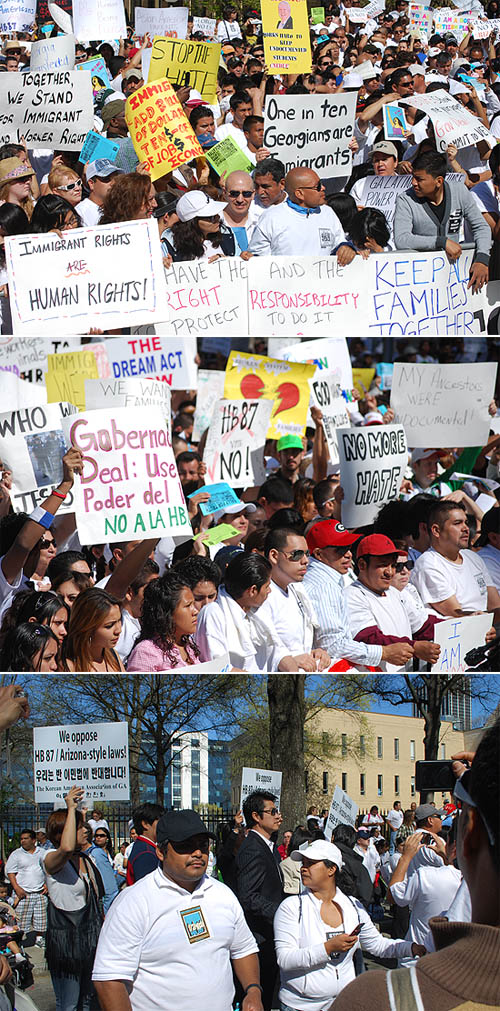 24일 오전 10시 조지아 주청사 앞에는 애리조나식 법안 HB 87과 SB 40에 반대하는 1만여 명의 시위자들이 운집했다.