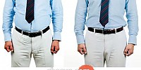 - 배꼽 한참 아래 허리띠를 맨 모습(사진 왼쪽). 실제보다 배가 더 나와 보인다. 오른쪽은 알맞은 높이에 맨 모습. 의상 협찬 및 도움말=로가디스