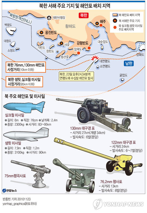 북한은 또 사곶과 해주, 옹진반도 등 서해안 주요 기지와 섬에 130mm(사정 27km), 76.2mm(사정 12km) 해안포와 152mm(사정 27km) 지상곡사포(평곡사포) 등을 배치해 놓고 있으며, 지난 1월17일 ‘대남 전면대결 태세 진입’ 성명 이후 포 진지를 노출해 놓고 있다.