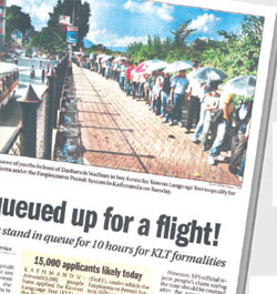 올 6월 15일 네팔 젊은이 1만5000여 명이 한국어능력시험 응시원서를 내기 위해 접수장앞에 길게 줄을 서 있다. 네팔 현지 신문은 이를 주요기사로 다뤘다.