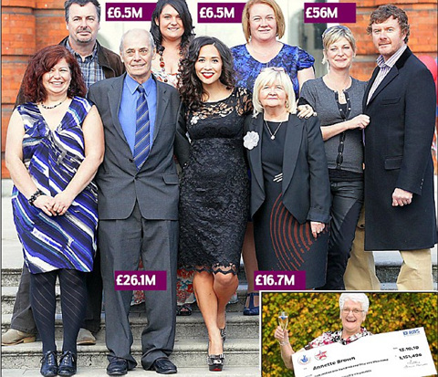 ▲ 복권 당첨 이후 한자리에 모인 '잭팟 클럽' 멤버들. 오른쪽 작은 사진은 가장 최근에 회원이 된 아네트 브라운씨./출처: 데일리메일 홈페이지