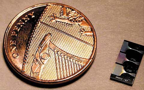 - ▲ 광회로칩 샘플(오른쪽)과 1페니짜리 동전이 나란히 놓여 있다. 광회로칩을 사용한 양자컴퓨터는 보안 면에서도 성능이 월등해 보안을 중시하는 기관들로부터 각광을 받을 전망이다. /아이리시타임스닷컴