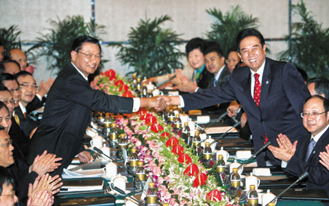 ▲ 중국과 대만이 29일 경제협력기본협정(ECFA)에 정식 서명했다. 이날 협상장인 충칭(重慶)시 소피텔 호텔에서 중국측 대표인 천윈린(陳雲林) 해협양안관계협회 회장(오른쪽)과 대만측 장빙쿤(江丙坤) 대만해협교류기금회 이사장이 서명에 앞서 악수하고 있다. /AP 연합뉴스