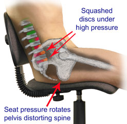 그러나 오래 앉아있게 되면 아래 요추 곡선(the lower lumbar curve)이 무너져 척추의 자연스러운 S형태를 C형태로 만들게(turn the spine’s natural S-shape into a C) 된다. 그렇게 되면 신체를 지탱하는 복부와 등 근육계를 저해해서(hamper the abdominal and back musculature that support the body) 신체가 구부정하게 되고(be left to slouch) 옆배힘살과 사근(斜筋)이 약해지면서 신체를 지탱할 수 없게(the lateral abdominal and oblique muscles grow weak and unable to support it) 된다.